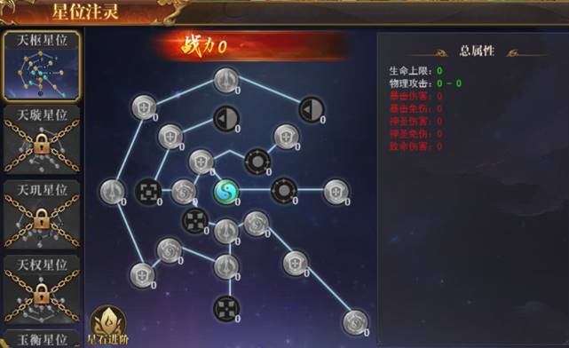 星位:消耗星辰灵气(摘星阁、星辰试炼获取)可以点亮星位,获得大量稀有属性,特殊部位需要镶嵌星辰宝石才可突破去点亮下一阶部位。