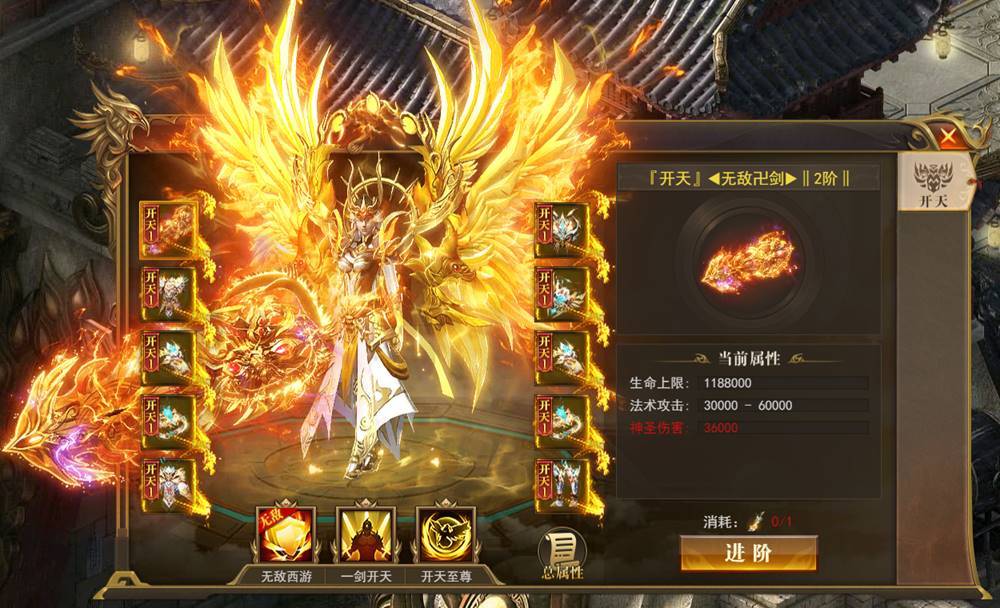 7、新增开天无敌神装,开服30天开启,入口:仙装旁 至尊 图标;穿戴可获得超高战力,还可激活无敌西游、一剑开天、开天至尊特殊效果