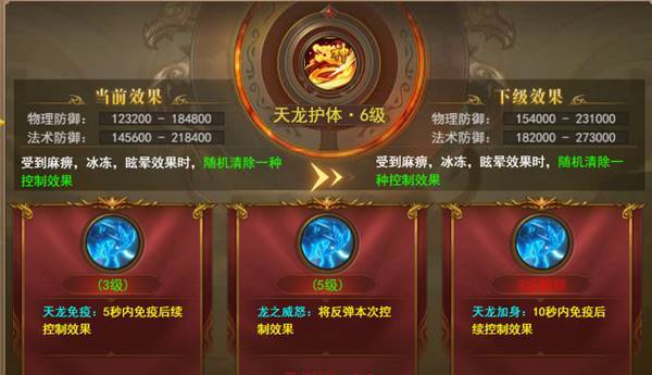 被动神技:天龙护体--受到麻痹、冰冻、眩晕效果时,随机清除一种负面效果,技能提升到3、5、8级还可以激活特殊效果
