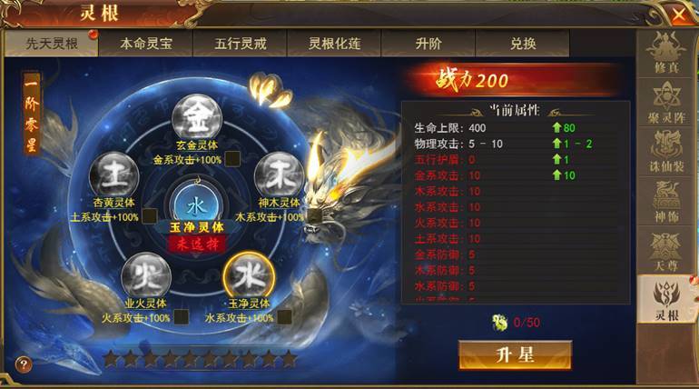 激活先天灵根对应灵体可增加100%对应五行攻击,每人仅可激活一种灵体,每日可消耗钻石重新选择一次灵体(每日限一次)。