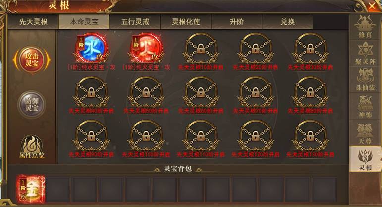 选定先天灵体后可装备本命灵宝,装备攻击、防御型时本命灵宝可获取对应五行属性,提升先天灵根阶数可装备更多本命灵宝。