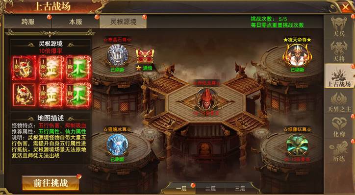 开服达标90天开启,每日挑战5次,每日0点重置次数,可获取本命灵宝、五行灵戒,提升灵宝总等级可前往更高层灵根源境;