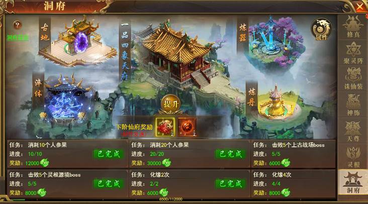 提升洞府等级(完成洞府每日任务可获取洞府经验)可解锁淬体、炼丹、炼器和古地玩法。