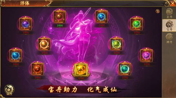 宝丹淬体,化气成仙。使用丹药(炼丹玩法产出)淬炼灵体,可提升角色各项属性。