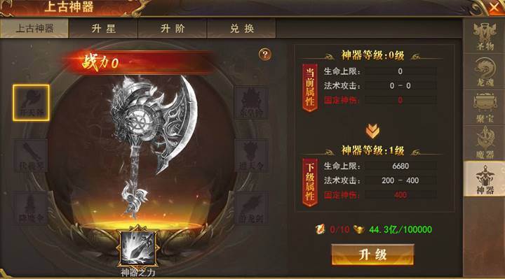 2阶以上神器可进行升星,增加大量属性,升星后的3阶神器可拆解为对应数量的0星3阶神器。