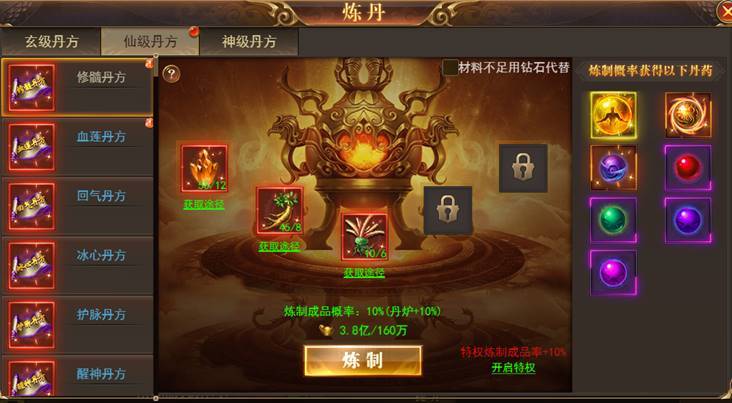 炼丹:点击丹炉可选择丹方进行炼丹(需要获取对应丹方并激活),概率炼制出对应丹方丹药,部分丹方需要丹炉达到对应品级才可炼制。