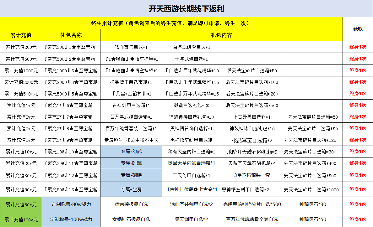 若玩家您满足游戏内单服单角色角色历史充值达到相应的档次,即可申请领取相应的奖励,详情请查看下方表格图片查看。