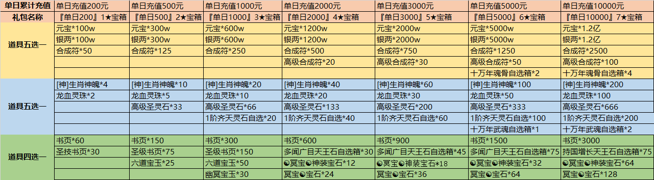 在玩家满足游戏内单服单个角色单日累计充值达到相应的金额档次,即可领取对应的奖励,详情请查看下方表格图片查看