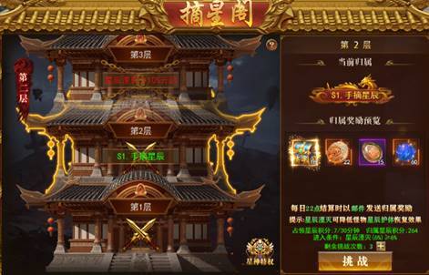摘星阁为跨服玩法,每层达标一定星辰湮灭值可挑战,每日5次挑战次数(可钻石购买),次日重置;