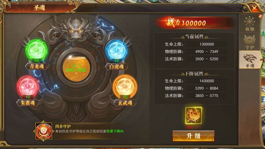6、新增血脉圣魂,开服30天开启,入口:血脉-圣魂,升级可激活四圣守护获得百分比属性加成和伤害下降效果