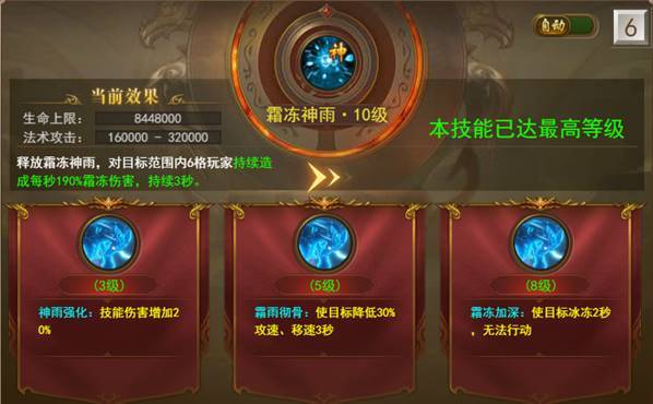 法师神技:霜冻神雨--对目标范围6格玩家持续造成霜冻伤害打击,技能提升到3、5、8级还可以激活特殊效果