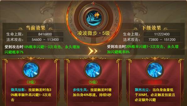 被动神技:凌波微步--受到攻击时概率闪避1-3次攻击,永久增加闪避概率,技能提升到3、5、8级还可以激活特殊效果