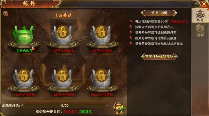 丹炉初始品级为1品,炼丹可获得炼丹经验提升丹炉品级,品级越高炼制成品概率越高;