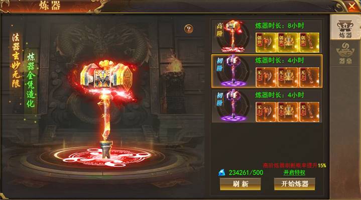 每次炼器需要消耗一定时间完成(可消耗钻石加速)。