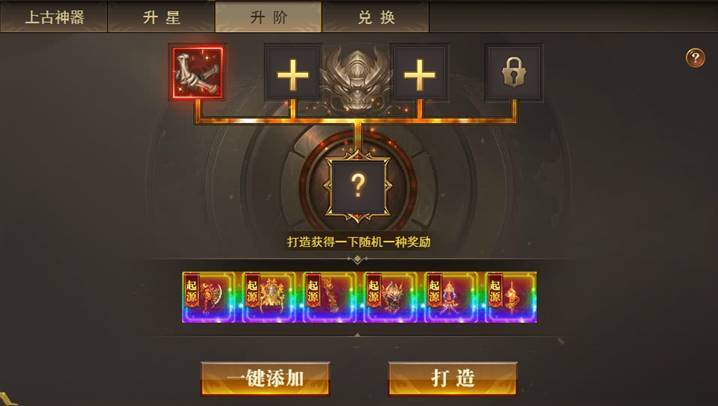 神器升阶:创世品质(3阶神器)上古神器+悟道佛骨可升阶为随机一件起源装备(4阶神器)。